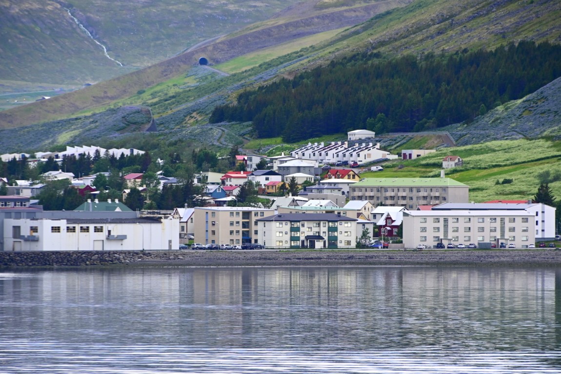 I was out on deck at 6:30 am, the weather was nice for sail into Isafjordur with the Nieuw Statendam on our tail…  The Zuiderdam being a smaller of the two ships, we were able to dock in town earlier than anticipated.  Our guide/driver Svavar was early as well…this was good because we arrived at the Dynjandi Waterfall before the crowds.  Our friends from the 2020 Grand South America Voyage, Joan and Gary joined us on today’s excursion.  Joan and Gary are avid hikers so the waterfall climb was right up their alley.  The landscape driving to the waterfalls was spectacular and made more dramatic with the fog and mist that came and went.  It was raining when we got to the falls but that did not deter us from climbing up the waterfall.  Dynjandi Waterfalls, is the largest of its kind in the region and is rightfully coined as the “Jewel of the West Fjords”.  The rain did stop before we headed back to Isafjordur.  We had Svavar drop us in town and we went to the church, walked along the waterfront, stopped in the center of town to look for some souvenirs.  The town has some interesting-colored homes.  We headed back to the ship just in time before the rain started.  The clouds cleared and we had sun and blue skies for the remainder of the afternoon…a different look when the sun is out.  Another great day and tour in Iceland.